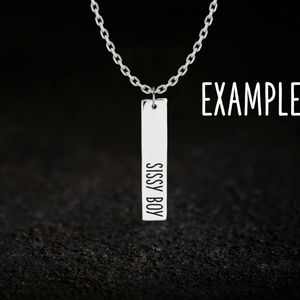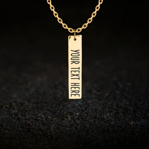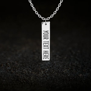 A custom rectangular bar style necklace, allowing you to add a single row of text to the front as well as optionally to the back.