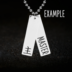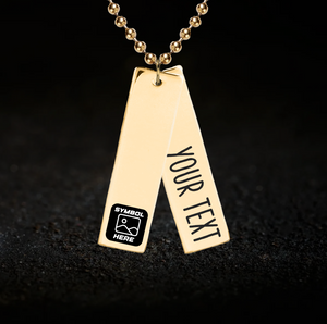 A custom rectangular bar style necklace featuring two pendants which overlap one another. The top pendant allows you to add an emblem whilst the lower one allows you to add text. Optional personalisation also available to the back.