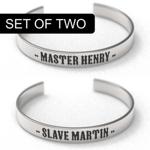 A set of two master and slave cuff bracelets, complete with a personalised name of your choice on each of the bracelets.