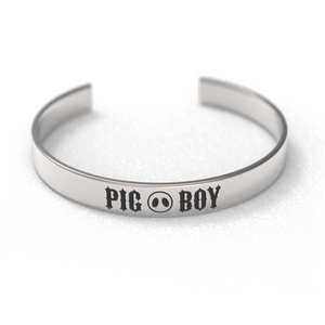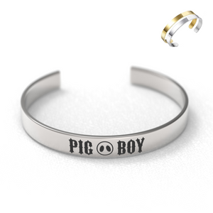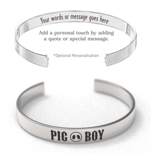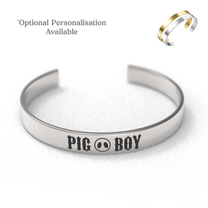 A single pig boy cuff bracelet, made from high quality materials and comes with the option to personalise the inside of the bracelet for a personal touch.