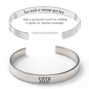 A single sissy cuff bracelet, made from high quality materials and comes with the option to personalise the inside of the bracelet for a personal touch.