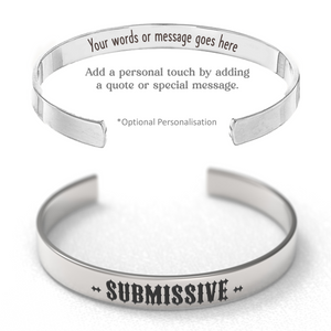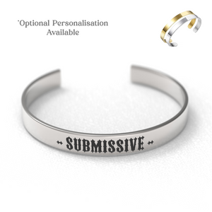 A single submissive cuff bracelet, made from high quality materials and comes with the option to personalise the inside of the bracelet for a personal touch.
